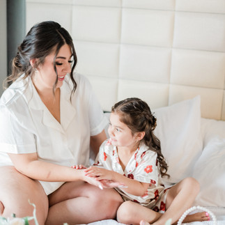 The girls chatted and relaxed in their matching silk pj’s while watching each other in the hair and makeup stations. The bride was lit perfectly by soft window light as we captured her sweet moments with her mother and daughter.