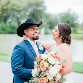 The bridesmaids wore rust-colored dresses and Angelica’s bouquet had touches of orange beech leaves, golden butterfly ranunculus, rose hips, and big champagne roses. The shape complimented the delicate tulle dress with lace overlay bits.